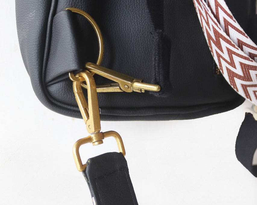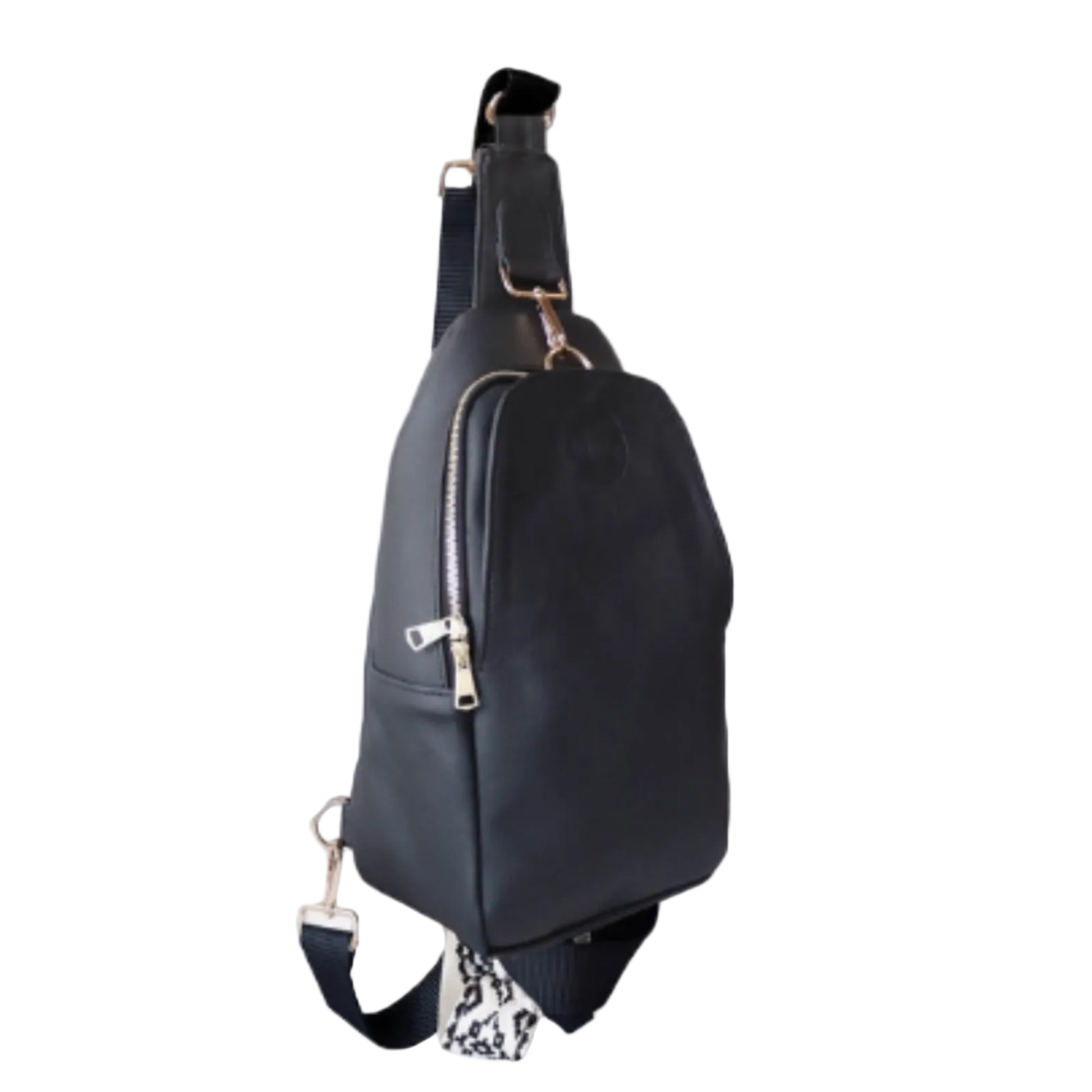 Designed to be both a crossbody sling bag or a backpack with luxury brass hardware.